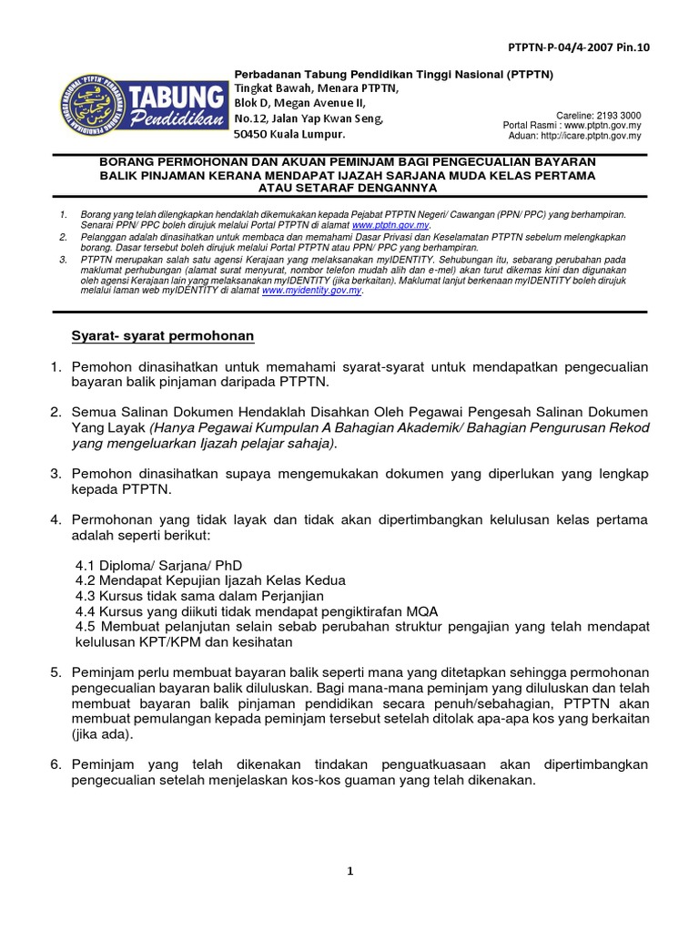 Borang Permohonan Dan Akuan Pinjaman Bagi Pengecualian Bayaran Balik Pnjaman Kelas Pertama Pin 10 2 from imgv2-1-f.scribdassets.com Pembayaran balik pinjaman ptptn, pertanyaan baki pinjaman ptptn & pengeluaran kwsp untuk bayaran. Oleh yang demikian, peminjam tabung pinjaman pelajaran (tpp) kpt tidak akan mendapat diskaun / pengecualian bayaran balik walaupun. Log into ptptn bayaran balik in a single click. No need to wander anywhere. Bayaran balik lebih awal adalah digalakkan kerana bayaran balik yang dibuat sebelum tarikh mula bayar tidak dikenakan kos upah. Suasana ibu pejabat perbadanan tabung pendidikan nasional (ptptn) di kuala lumpur. Bayar & menang ini diadakan untuk menggalakkan peminjam ptptn membuat bayaran balik pinjaman. Entri tutorial cik tom mengenai cara bayaran balik pinjaman ptptn ujrah melalui fpx ini ialah atas permintaan adik cik.