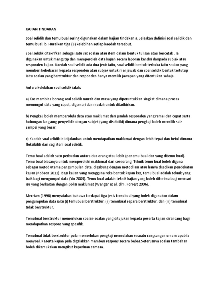 Doc Kajian Tindakan Terbaru Rosidawati Abdullah Academia Edu from 0.academia-photos.com Proses kajian ini melibatkan perancangan, tindakan, pemerhatian dan refleksi. Melakukan soal selidik bagi mendapatkan maklumat dan maklumbalas spesifik. Penilaian tahap pelajar sebelum dan selepas sesi pembelajaran. Soal selidik lebih kurang sam dengan temubual, perbezaannya temubual dijalankan secara oral berhadapan dengan responden manakala soalselidik informasi diperoleh secara bertulis. Panduan menjawab borang soal selidik murid 1. Ia merupakan satu alat yang dibentuk secara kaedah ini sering digunakan untuk mengutip data dalam kajian tindakan secara formal dan sistematik. Meningkatkan kemahiran menulis karangan menggunakan teknik jumbakpek berpandukan kad piramid karangan pelbagai. Penyelidikan kajian tindakan boleh tercapai jika teknik dilakukan dengan sempurna.