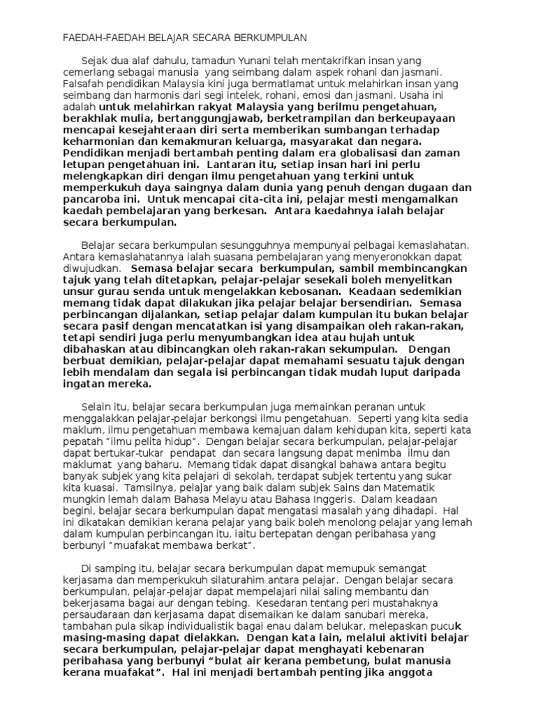 Karangan bahasa melayu spm / pt3 : Belajar secara berkumpulan mendatangkan banyak kebaikan kerana mampu membantu meningkatkan kefahaman tentang sesuatu pelajaran. Sekiranya caranya betul, belajar secara berkumpulan ini dapat menyelesaikan banyak masalah belajar. Mengamalkan belajar secara berkumpulan adalah satu fanemona yang baru dan jarang diamalkan dalam kalangan pelajar malaysia. Namun begitu, belajar secara berkumpulan juga mampu memberikan kesan buruk atau kurang efektif sekiranya ahli kumpulan tidak memberikan. Dengan belajar secara berkumpulan, pelajar dapat mempelajari nilai saling membantu dan bekerjasama serta menyedari kemaslahatan semangat kerjasama. Tulis sebuah karangan bertajuk kebaikan belajar secara berkumpulan. Belajar secara berkumpulan pun membawa faedah. Antara kebaikan belajar secara berkumpulan ialah 2 cara membeli kuota belajar telkomsel 10 gb hanya rp 10. Bincangkan tajuk kebaikan belajar secara berkumpulan. Antara faedah belajar secara berkumpulan ialah kita dapat menambahkan ilmu pengetahuan. Kebaikan bersenam secara berbasikal menggabungkan latihan fizikal dengan aktiviti luar, disamping meneroka pemandangan baru.